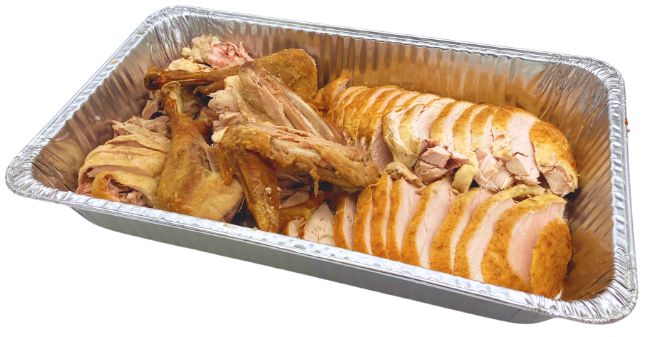 Our chefs slice the breast, de-bone and slice the thighs, and include the wings and drumsticks, leaving as much skin intact as possible.