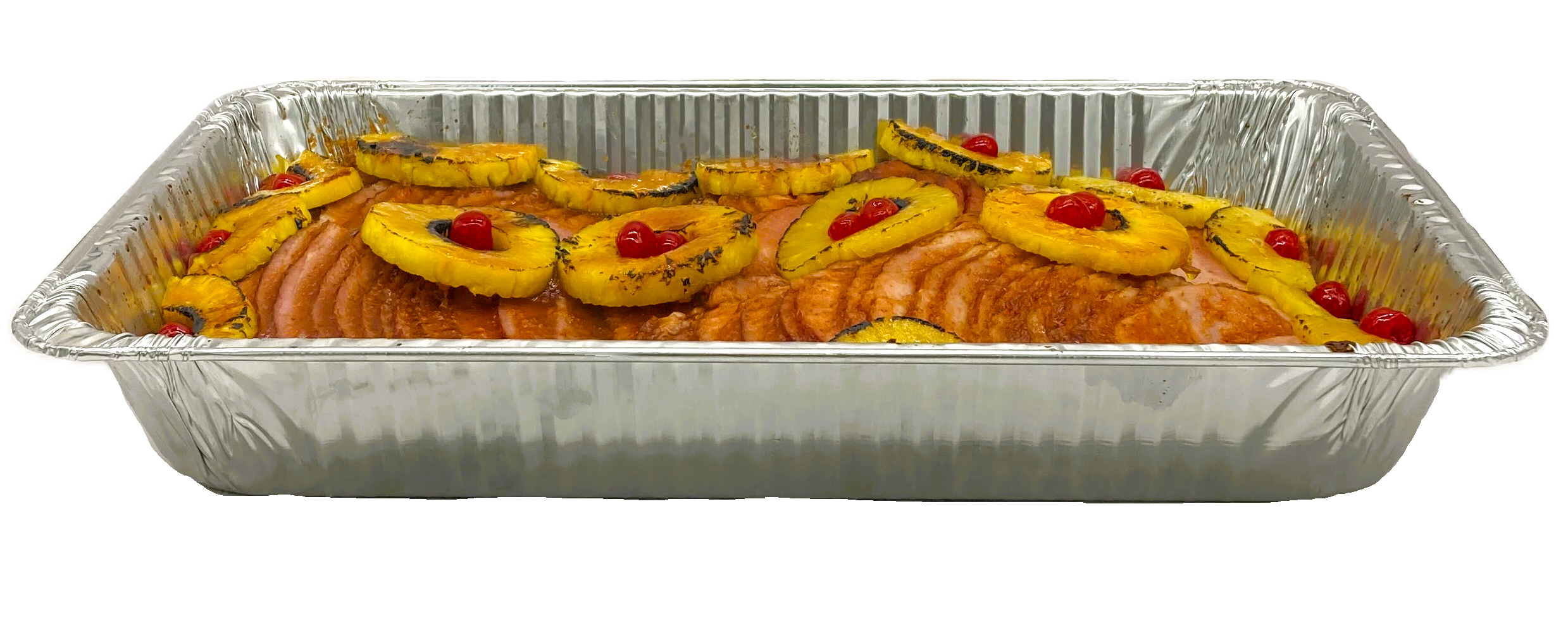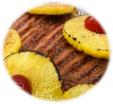 Slow roasted ham finished with a sweet pineapple and brown sugar glaze and garnished with classic maraschino cherries for a festive presentation.