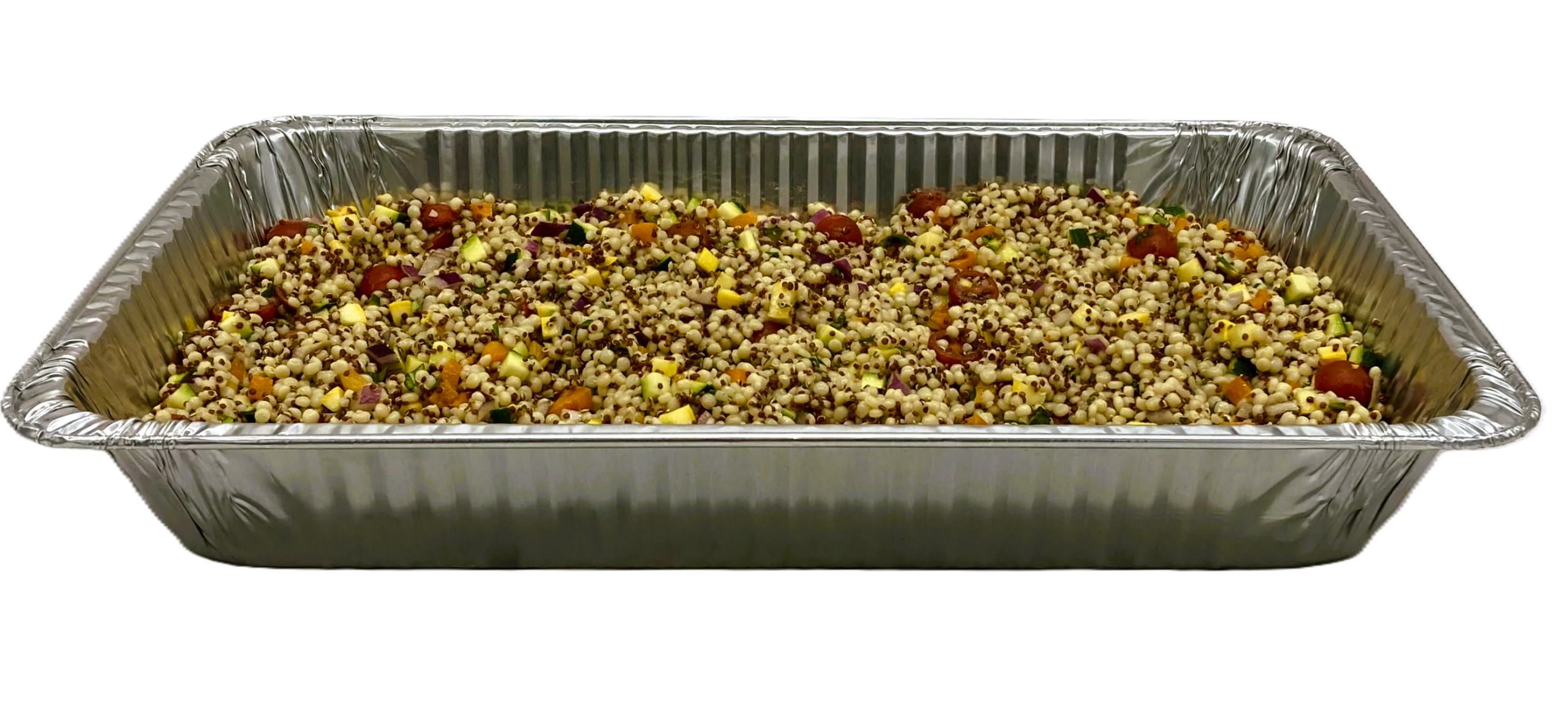 A light and colorful blend of cous cous and nutty quinoa tossed with lightly roasted vegetables (bell peppers, zucchini, squash, red onion), fresh herbs, and a bright honey mustard vinaigrette.